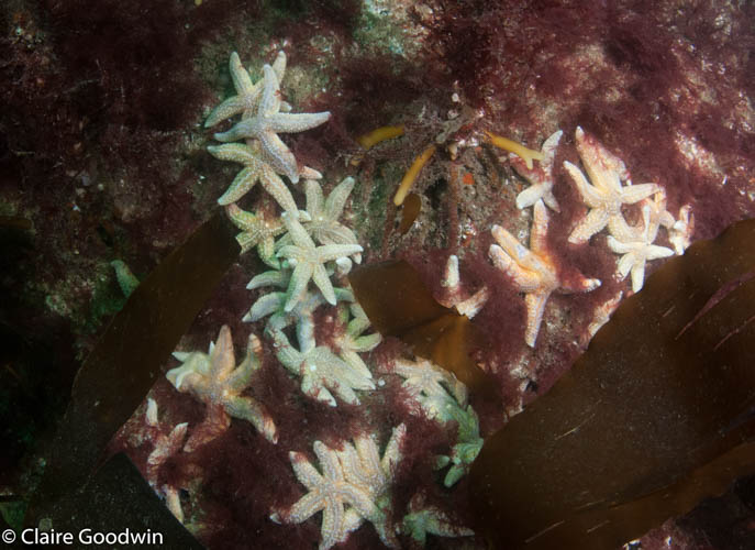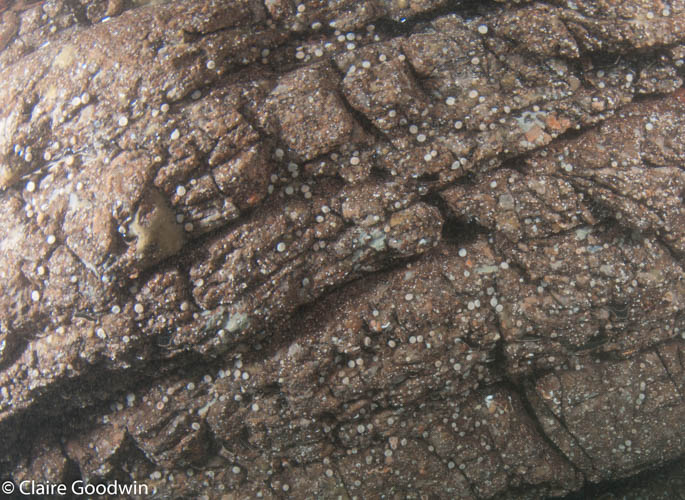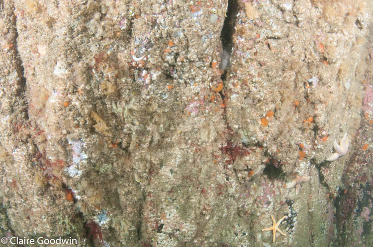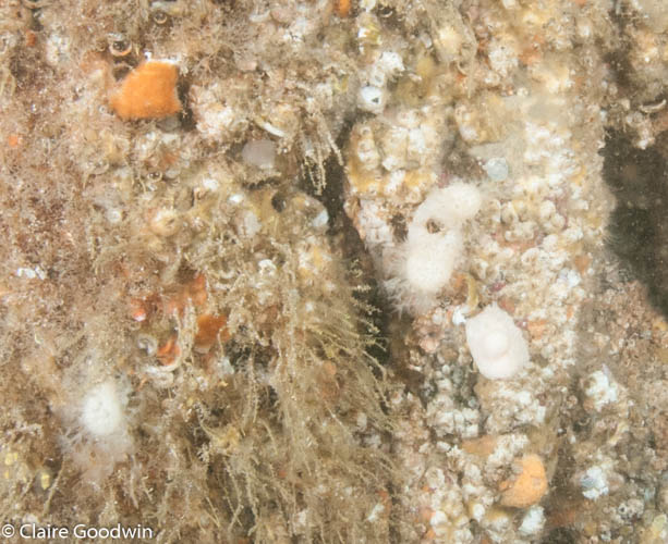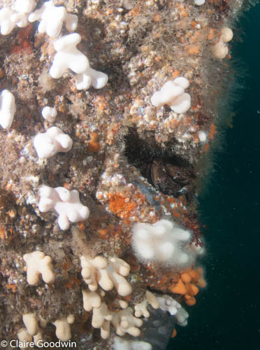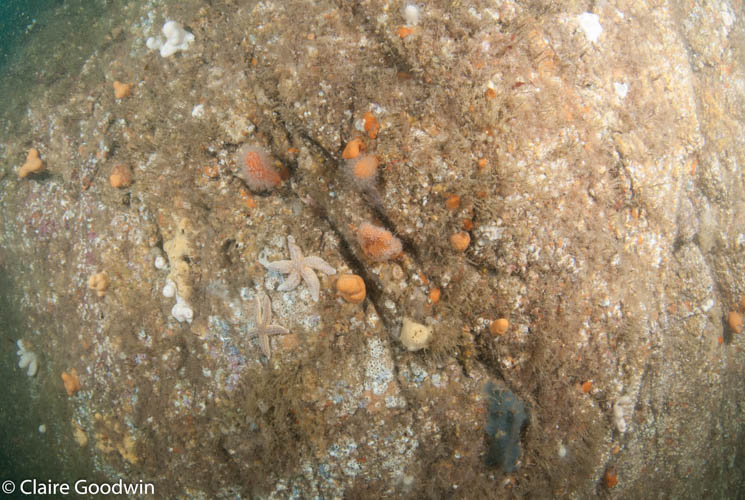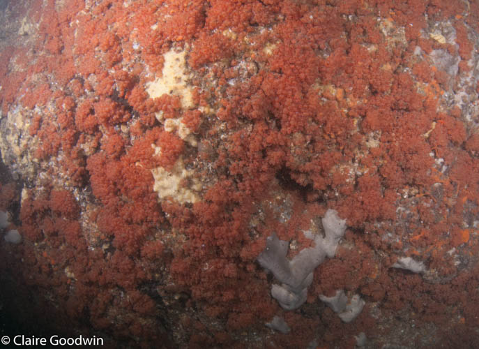 The walls of the gullies support kelp forest and a rich faunal community, which is particularly rich in sponges and anemones. Species recorded here include the scarce southern cup coral Caryophyllia inornata, a Northern Ireland Priority Species, and dense colonies of the baked bean sea squirt Dendrodoa grossularia. are rich in life, particularly sponges and anemones.