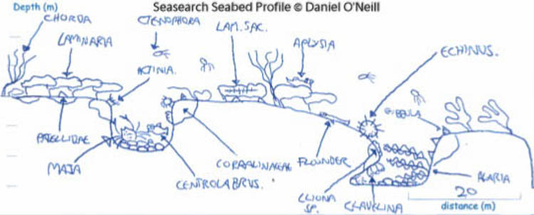 Gently sloping rocky seabed with a cave and gully. Outside the Blue Pool to the west there are two crevices, and to the east there is a cove with a gravel and boulder seabed. The rest of the seabed is mostly sandy.