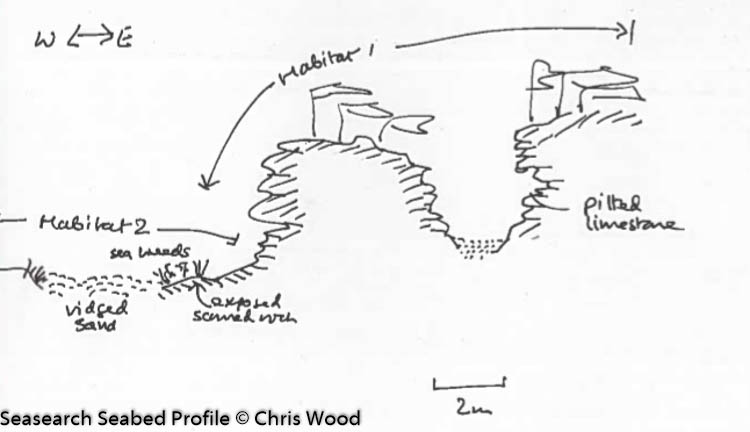 A limestone reef, with many crevices, a narrow 2 metre gully, and several overhangs. The seabed at the base of the slope is made up of cobbles and pebbles.