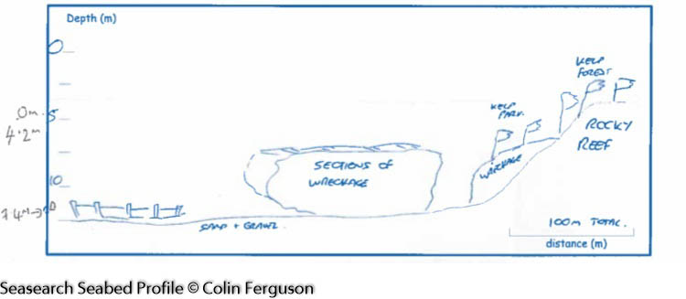 The rocky outcrop off Killard Point slopes down steeply to the seabed made up of cobbles, gravel and sand, where the wreck sits. The 2nd part of the wreck, further to the south east, is scattered into small pieces across the seabed.