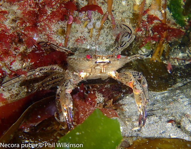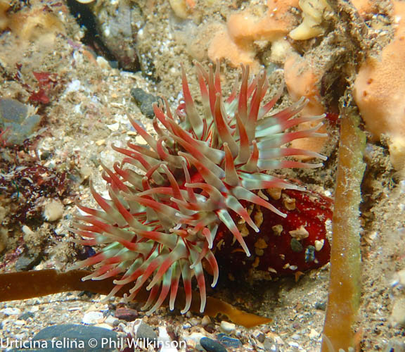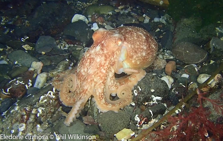 Various crustacean and anemone species, including the dahlia anemone Urticina felina, are common here. A variety of fish can be seen, such as wrasse and gobies. Keep an eye out for the unusual and slightly grotesque lumpsucker Cyclopterus lumpus which was filmed by Phil Wilkinson at this site recently. Bobtail squid Sepiola atlantica and octopus are often sighted here as well.