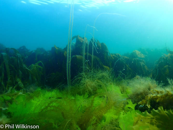 The site is a sandy seabed with areas of rock covered in mixed seaweed, including kelp (similar to the dive site at Groomsport Beach East).