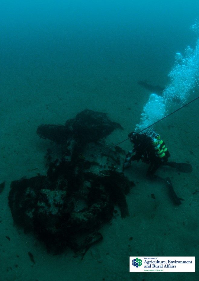 The Drake has been extensively damaged both by the original torpedo attack on the vessel, the wrecking of the Ella Hewett and the subsequent dispersal of both wrecks with explosives in the 1970s by divers from the Scottish and Northern Ireland Bomb and Mine Disposal Team. Despite the obvious damage sustained divers from Wessex Archaeology were able to discern in 2006 that there remains not only a main body of wreckage in ‘reasonable condition’ but ‘intact and recognisable’ structural remains. These observations were further verified by divers from DAERA’s Marine Scientific Dive Team in 2016.