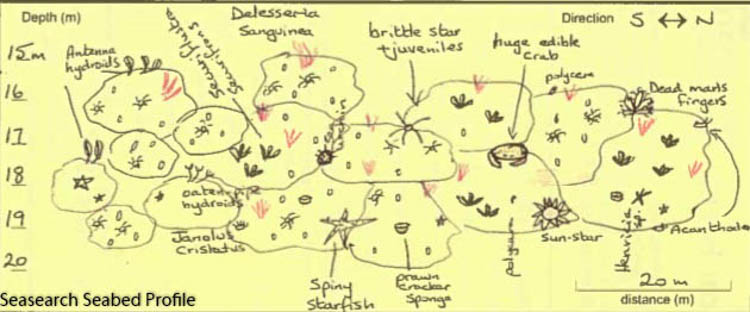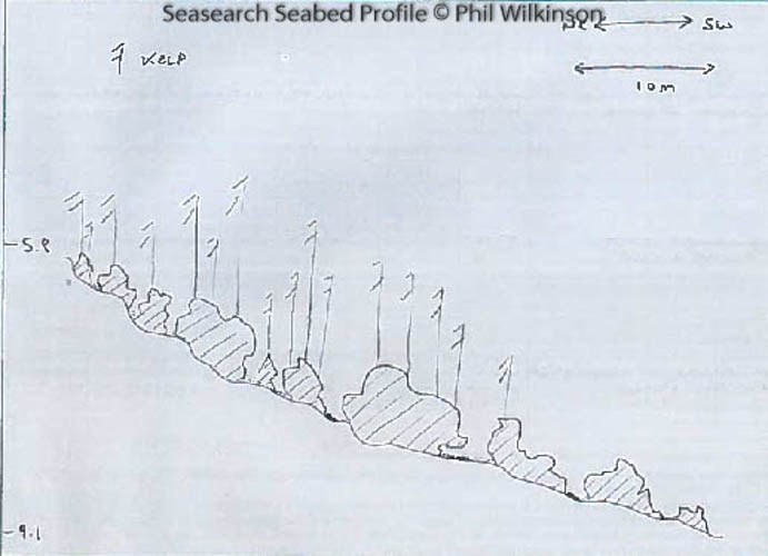 A vertical bedrock wall, 2-3m high with crevices and often heavillly silted. The seabed at the base of the wall is characterised by small boulders on fragmented shell, which slopes downwards into pebbles and cobbles.The seabed flattens out at approx. 19m where it is made up of sand and gravel.