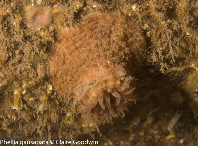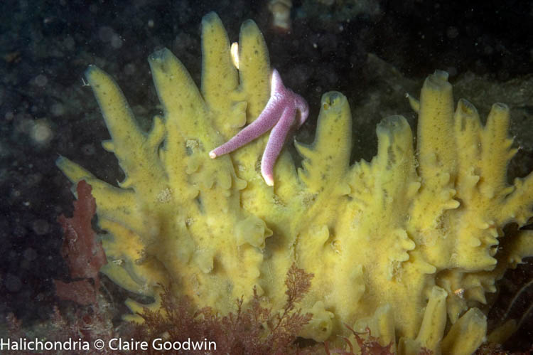 A diverse community of anemones, crustaceans, sponges, soft corals, hydroids, sea squirts and nudibranchs. The non-native invasive red alga species Bonnemaison’s hook weed Bonnemaisonia hamifera has been recorded here.