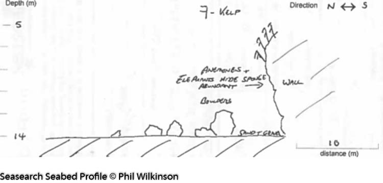 The limestone bedrock wall is densely covered in kelp park and faunal turf. Recent species recorded here include the Elephant’s hide sponge Pachymatisma johnstonia and the leopard-spotted goby Thorogobius ephippiatus.