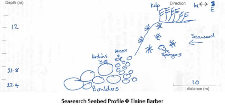 The upper section of the limestone wall supports kelp forest, which is replaced by a faunal turf with increasing depth, dominated by a variety of sea squirts, bryozoans and sponges.