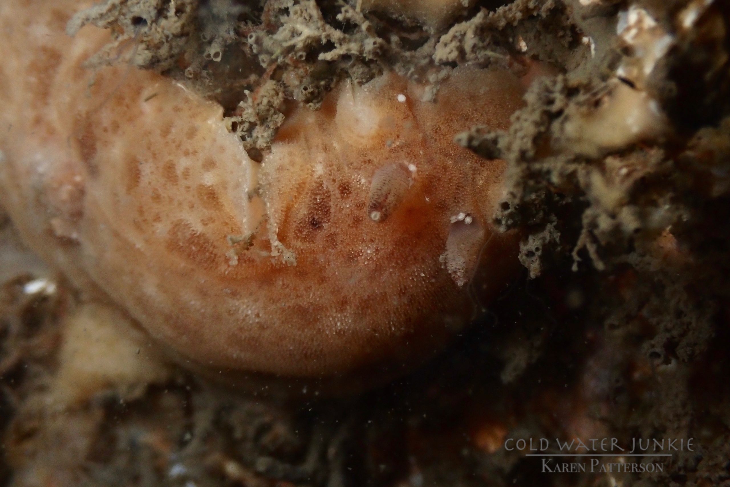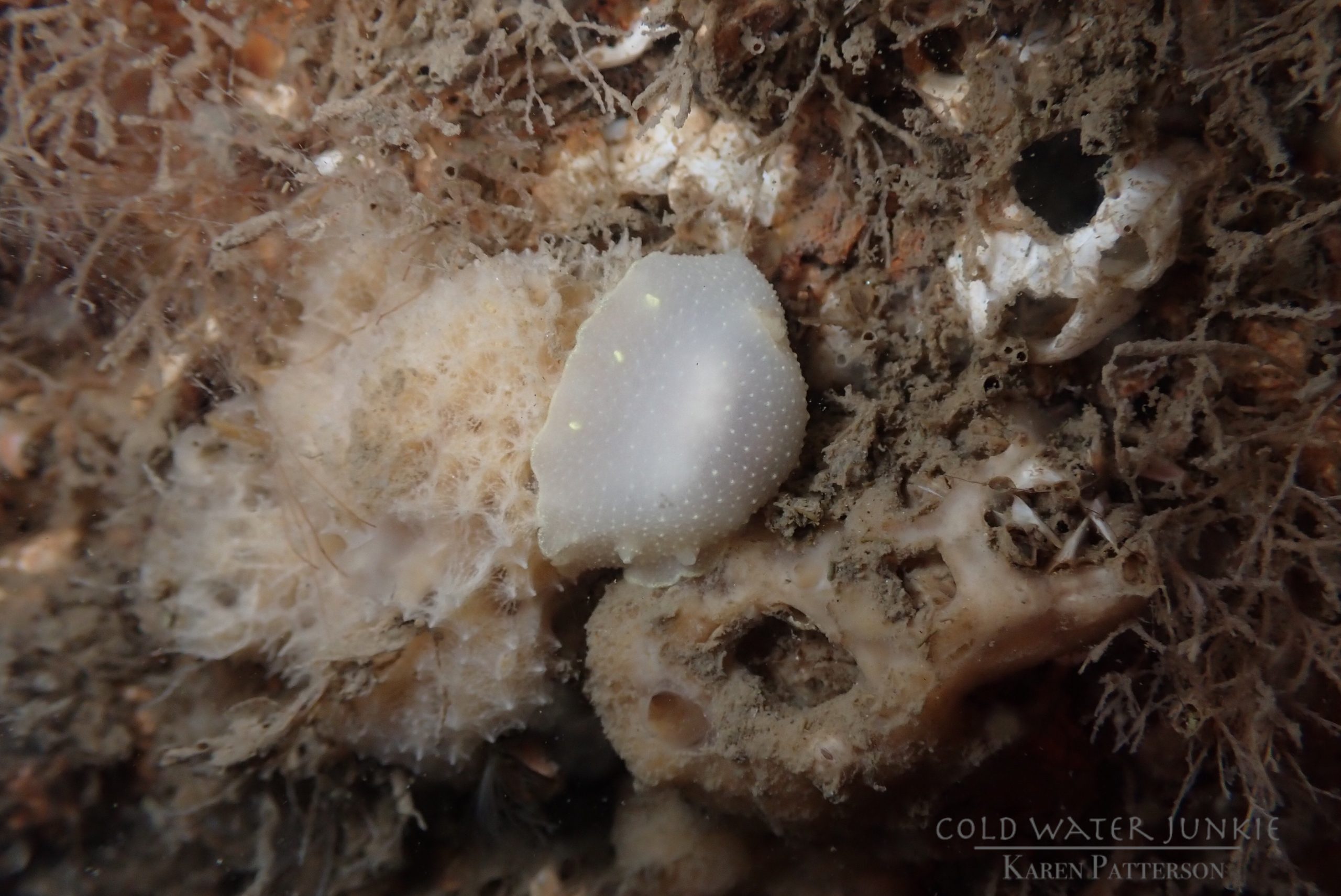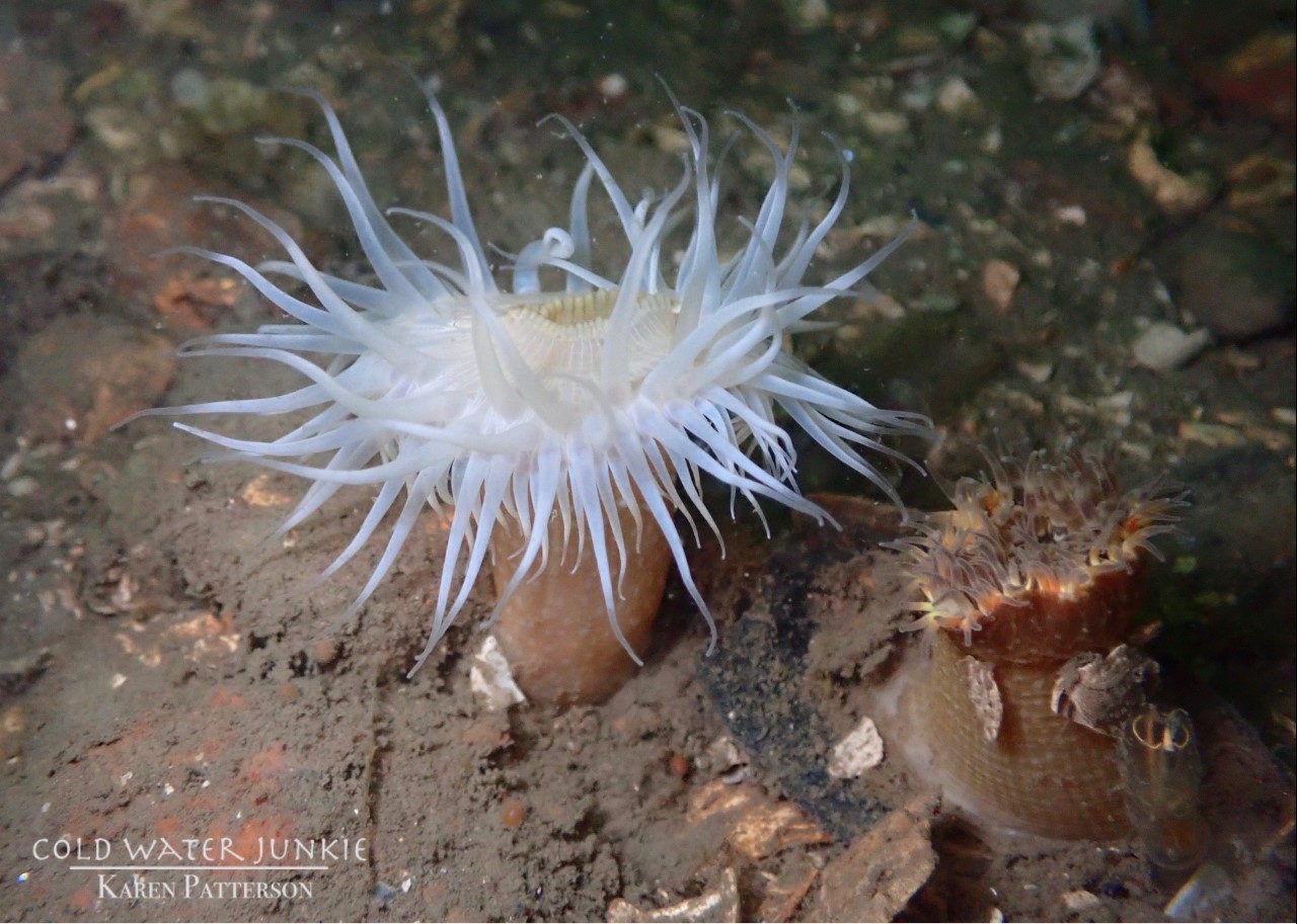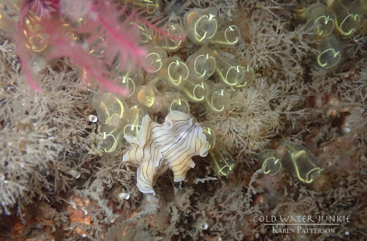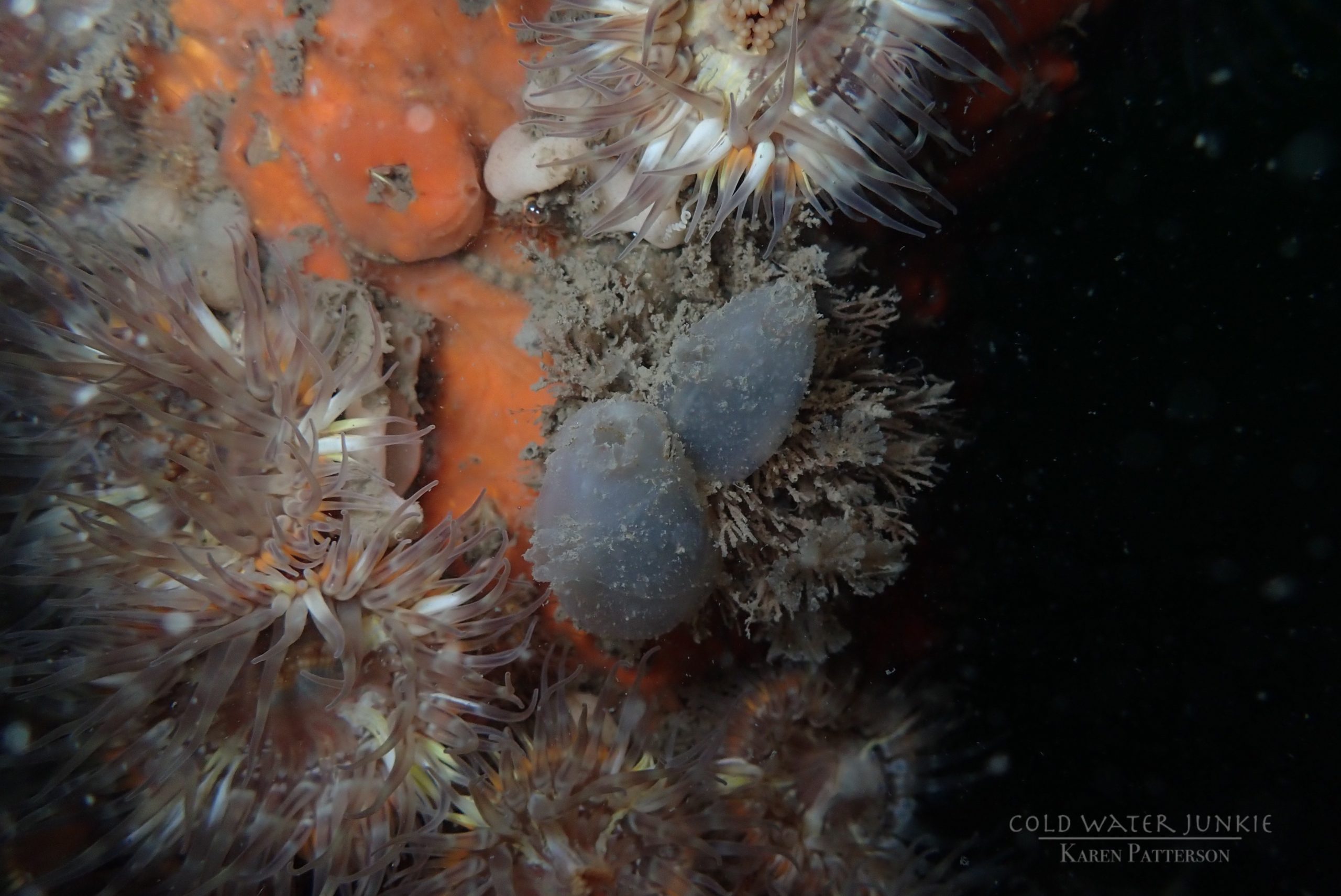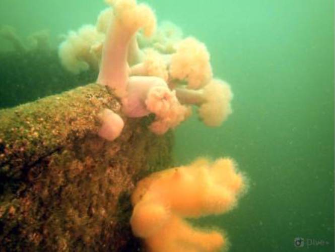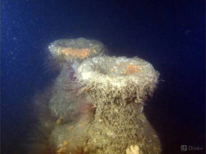 The wreck is covered in sea squirts and dead men’s fingers. Following the cable leading out to the wreck divers have recorded a variety of nudibranchs, sea snails Liparis sp. (a small clinging fish), tube anemones Cerianthus lloydii, rugose squat lobsters Munida rugosa and Atlantic bobtail squid Sepiola atlantica. The invasive Compass sea squirt Asterocarpa humilis has recently been recorded from Ringhaddy.