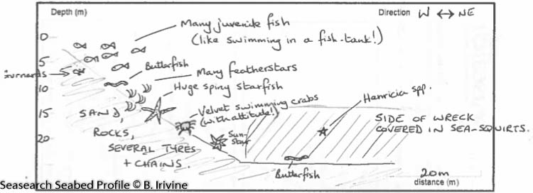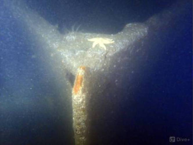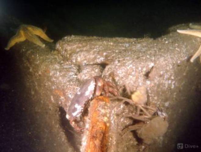 A muddy, gravelly, sandy slope with cobbles that leads down to the wreck at a chart depth of 23 metres. The wreck is sitting upright and almost entirely intact with an upright funnel. Wooden decks are decayed and wheelhouse is collapsed. This is a very silty site, so divers are recommended to keep off the seabed. Instead of swimming out to the wreck, you will find a nice shallower dive along the cable around 10 metres, with plenty of life.