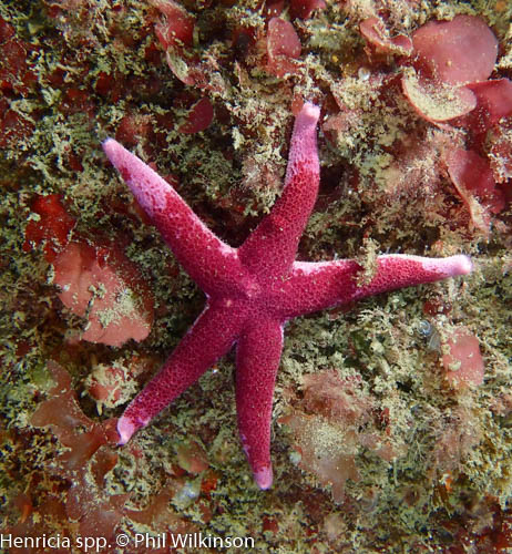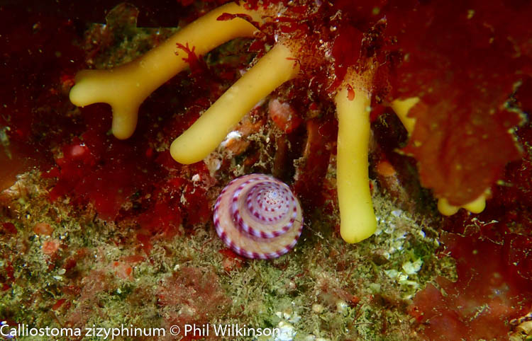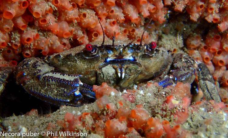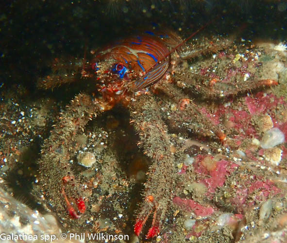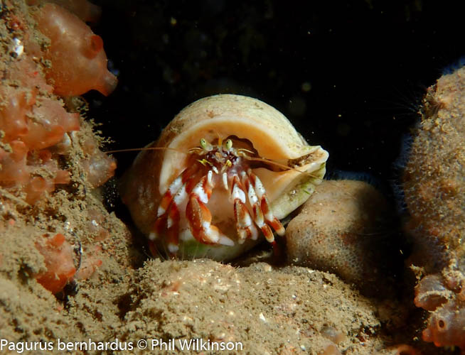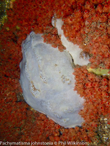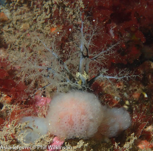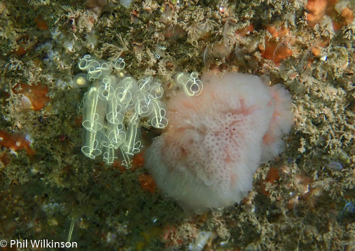 At the walls and swim through there are soft corals, numerous crustaceans, wrasse, anemones (including the white striped anemone Actinothoe sphyrodeta) and large, dense colonies of the baked bean sea squirt Dendrodoa grossularia. A white variety of elephant’s hide sponge Pachymatisma johnstonia is found on the cave walls.