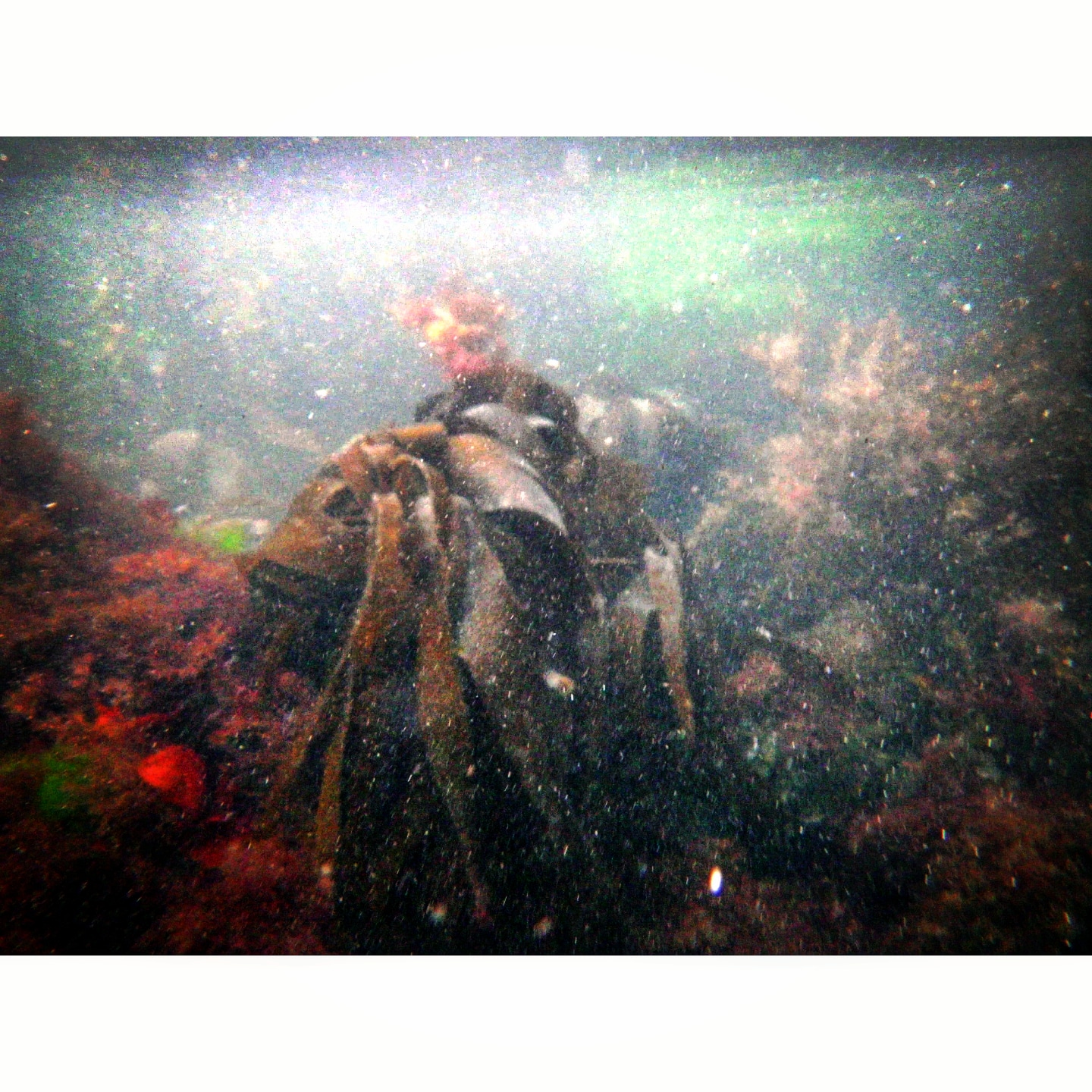 A diverse community of crustaceans, sea squirts and soft corals are found amongst a variety of alga species, including kelp, attached to the bedrock wall (at both sites either side of the harbour wall).