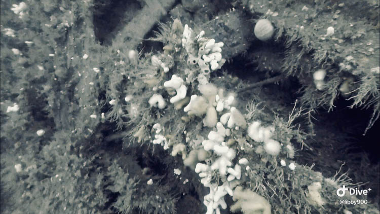 The wreck is covered in intermittent patches of dead men’s fingers, anemones, urchins and short animal turf.