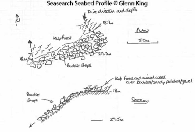 A sloping bedrock wall (12-26 metres) with boulders, cobbles and pebbles. The boulders are mostly small and interspersed with patches of stoney gravel and coarse sand.