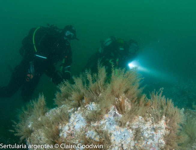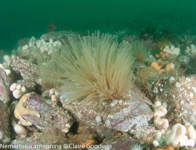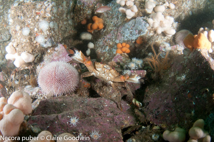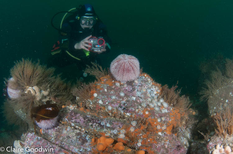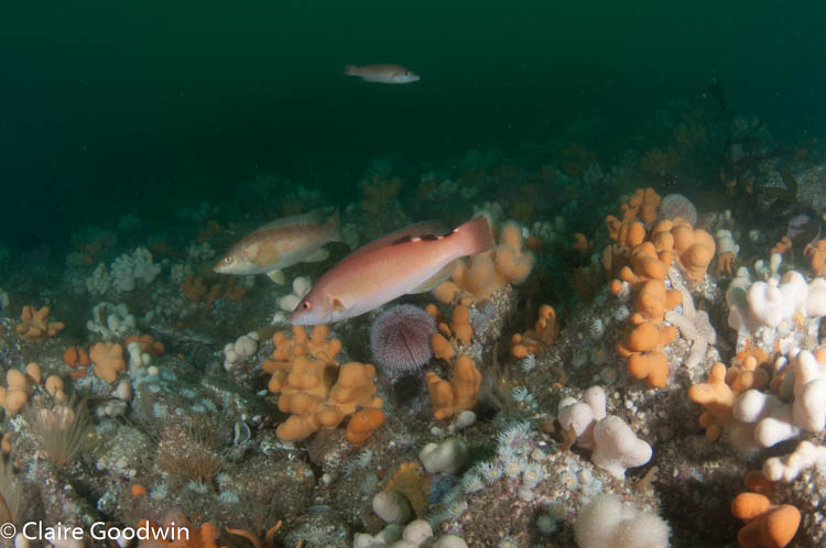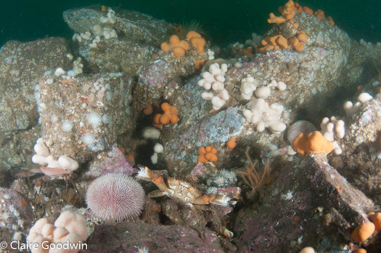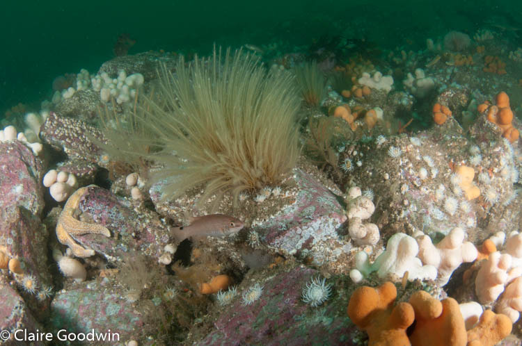 The bedrock wall supports a diverse community of marine invertebrate species, with clumps of the sandelled anemone Actinothoe sphyrodeta and the sponge Cliona celata.