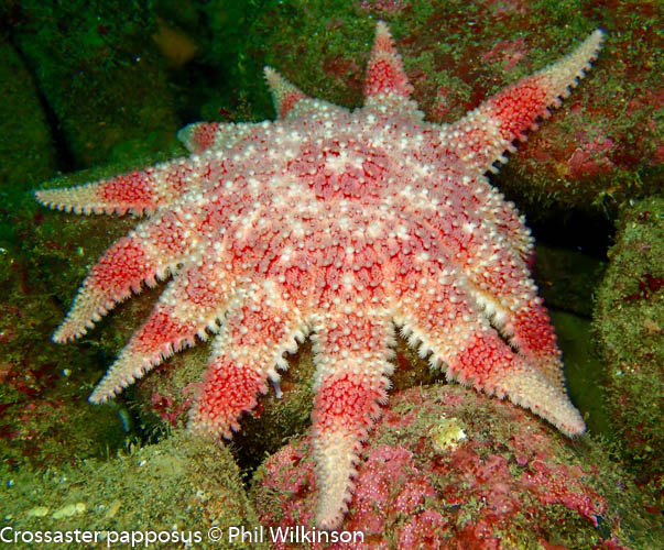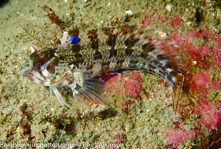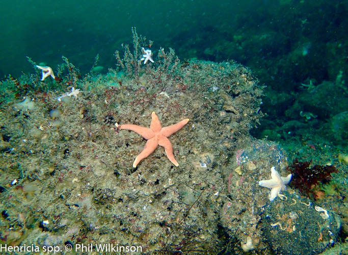 The bedrock and boulders are covered in kelp park, mixed seaweeds and faunal turf. A diversity of reef fish can be seen, including the two-spotted goby Gobiusculus flavescens and the Tompot blenny Parablennius gattorugine.